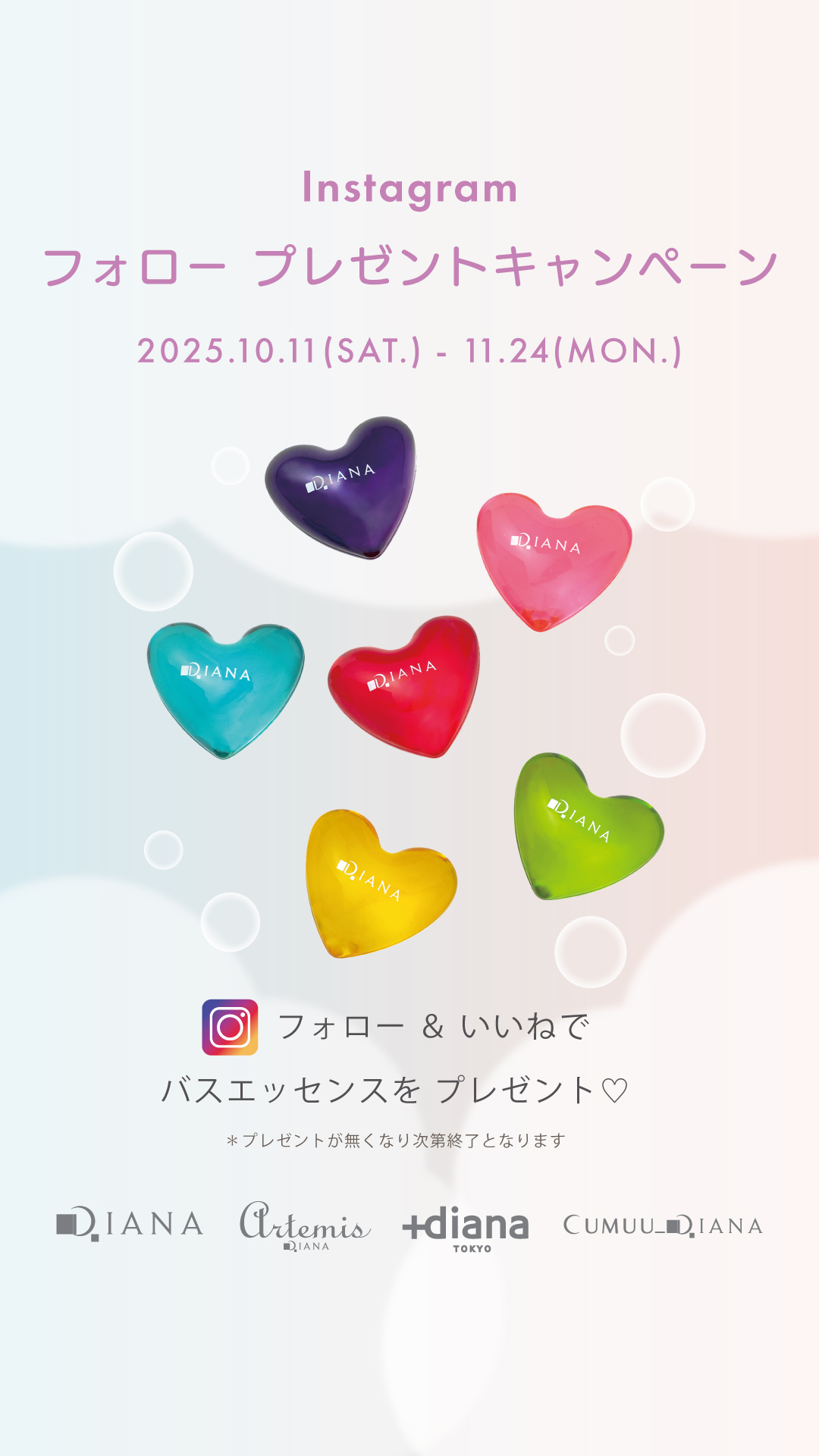 日頃のご愛顧への感謝を込めて、ダイアナInstagram対象アカウントへのフォロー&いいねで、ハート型バスエッセンスをプレゼントいたします♡
