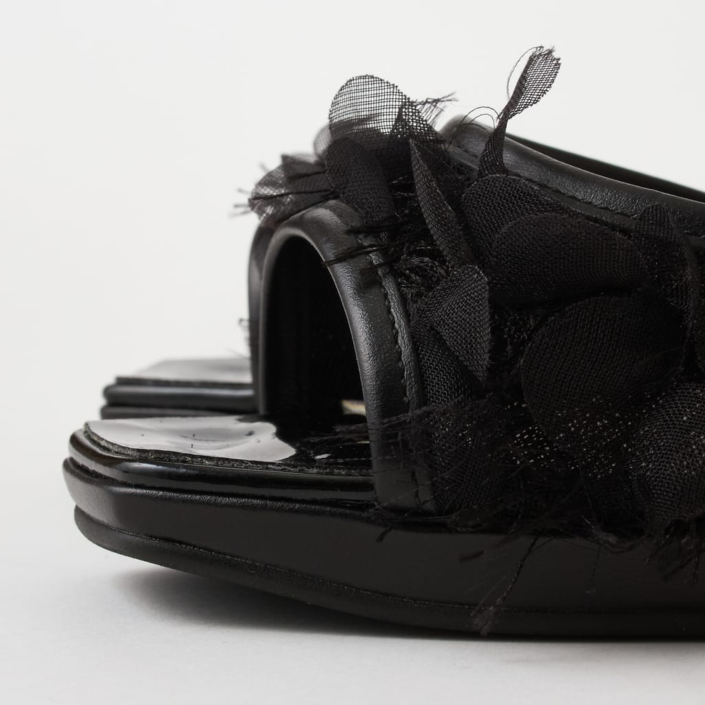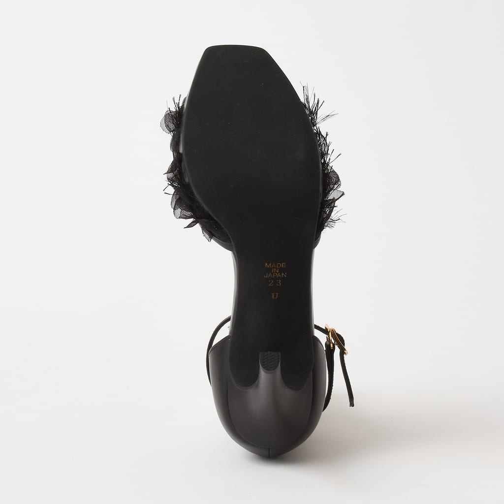・チュール素材は非常に繊細です。水や汚れに弱く、引っかけたり継続的な摩擦により傷を生じたり切れる可能性があります。ご着用の際には十分ご注意ください。チュール素材のためお伸ばしのご調整はご遠慮ください。
