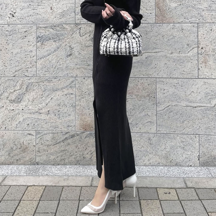 ★クリスタルストーンのビジューテープが華やかな9pヒールパンプスです。履き口は外側が広いVカットになっており、足の甲をすっ霧見せてくれます。トゥ先の斜めラインは深すぎず浅すぎない絶妙な位置に配することで洗練された印象に。凹凸感のある白黒ツイードを大胆にあしらいました。存在感のあるツイードと、チュール生地のコントラストが魅力。シンプルなシルエットだからこそ、カットラインの美しさが際立つデザインです。