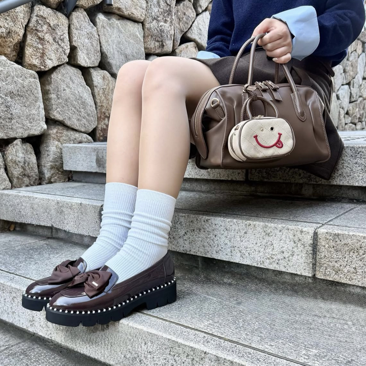 ・エナメル素材は他の物からの色移りが起こりやすく、一度ついてしまうと取れません。また、経年劣化が生じる可能性がございますので、ご使用および保管の際にはご注意ください。