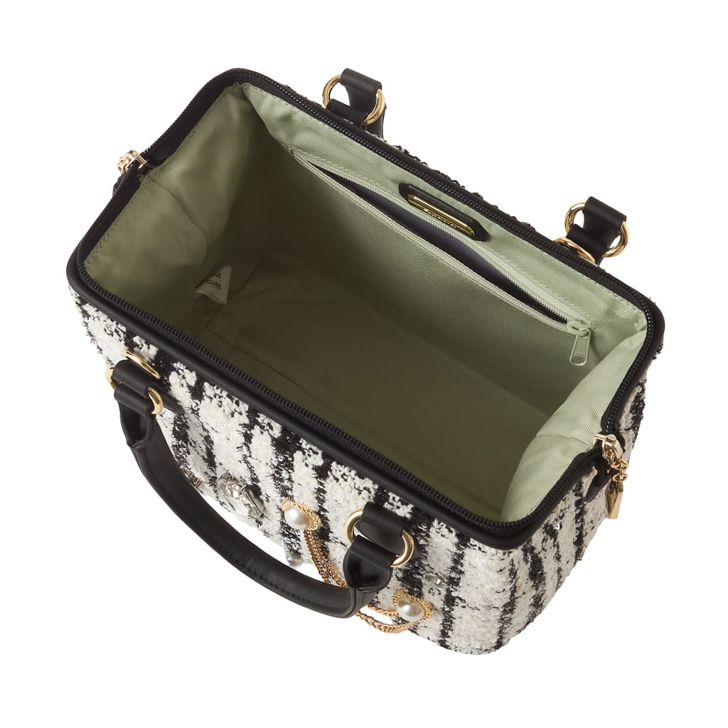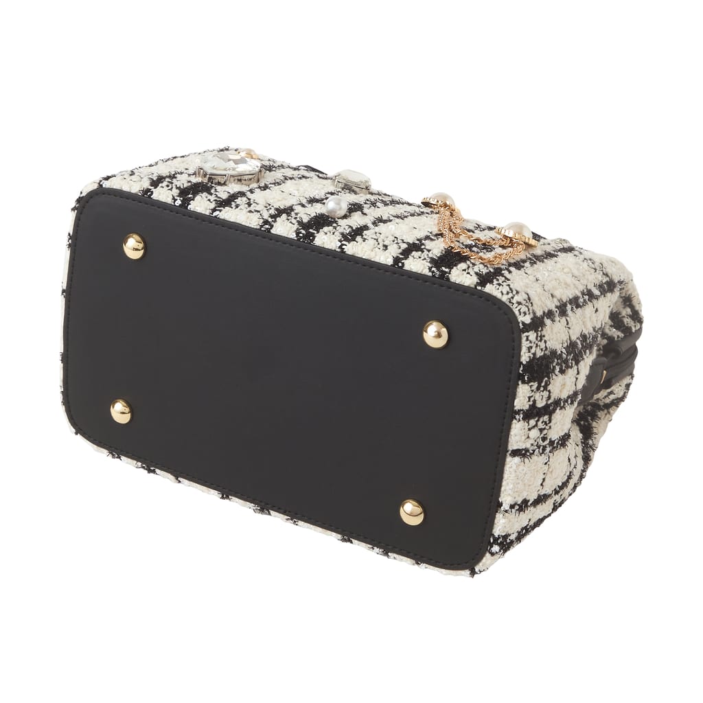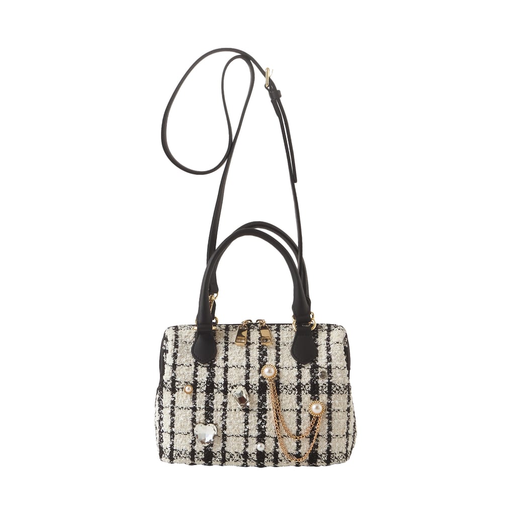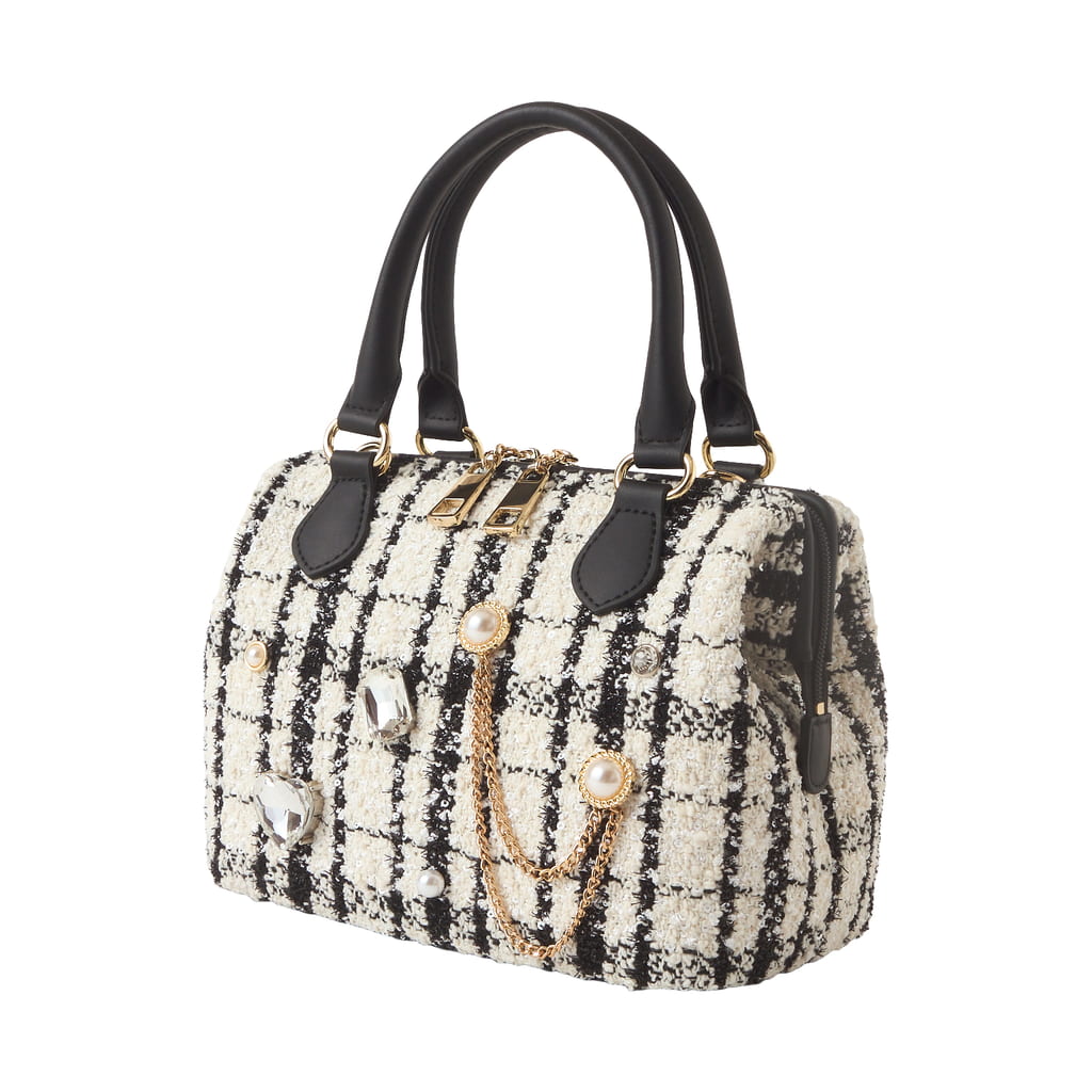 ・ツイード素材は汚れや水濡れ、ひっかけ等には弱い素材です。飾りは固定されています。強い衝撃が加わると破損する恐れがございますのでご注意ください。またチェーンのひっかけにはお気を付けください。