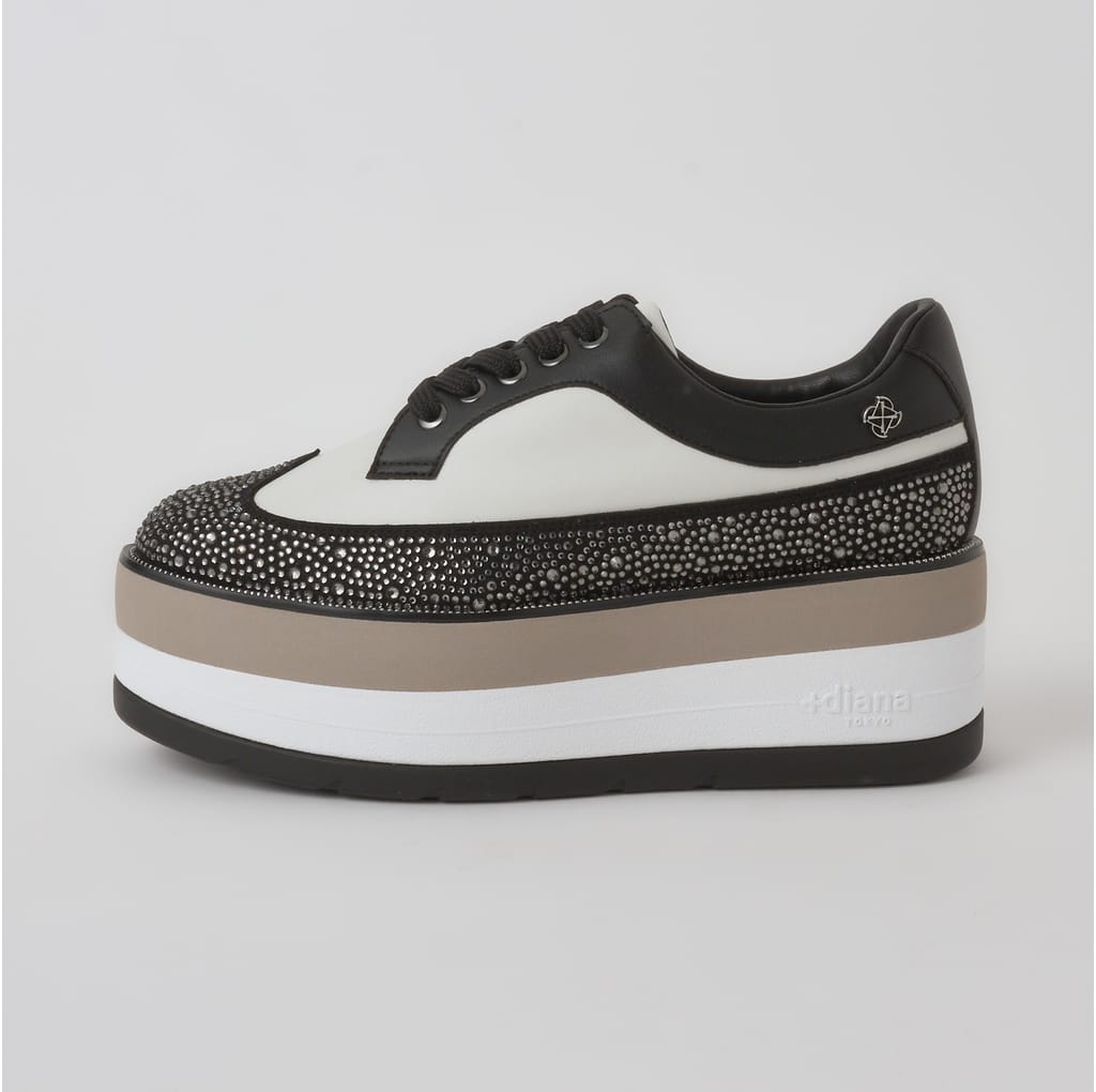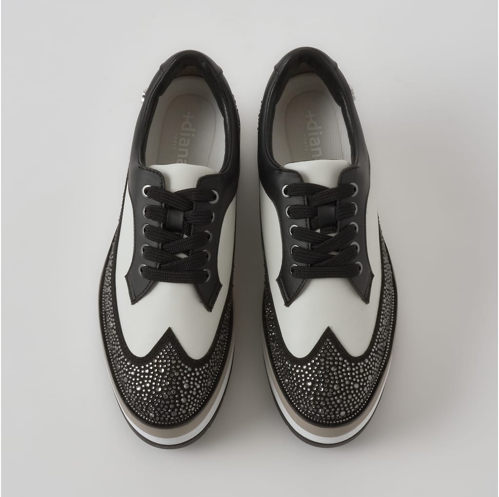 ★デザイン性・履き心地・仕立ての丁寧さにこだわった、プラスダイアナの中でも特別な価値をもつ、Made in Japanの『プレミアムライン』。クラシカルなウィングチップデザインに、6cm厚のボリュームソールを合わせたハイブリッド感が新鮮です。ぎっしりと敷き詰めたラインストーンがラグジュアリー煌めき、クラシカルな佇まいに抜け感をプラス。いつものコーディネートをさりげなく格上げしてくれる一足です。