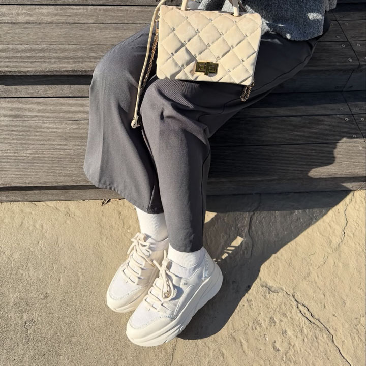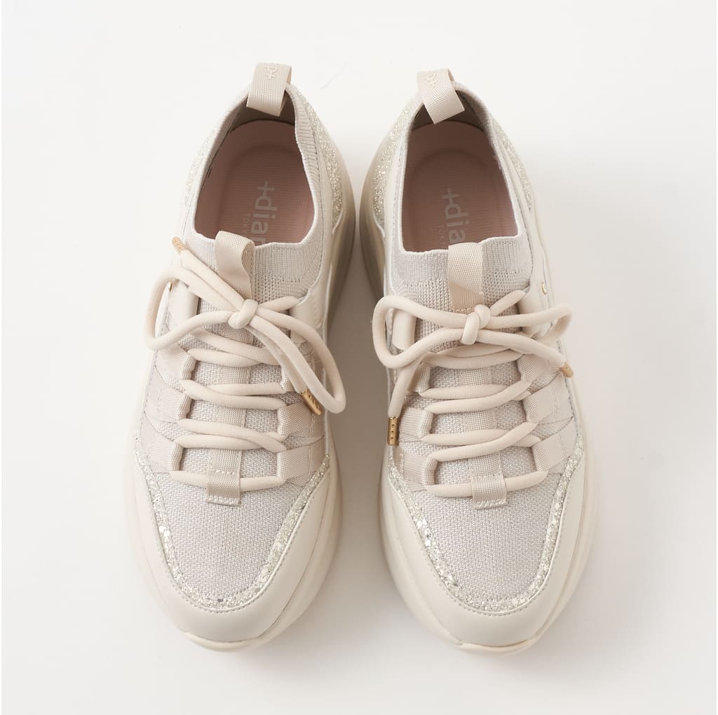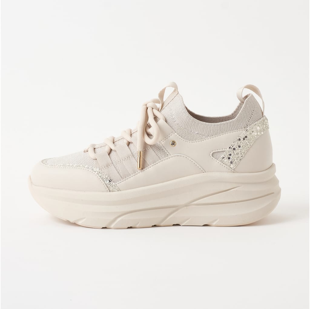 ・人工皮革スムース、撥水加工済リサイクルニット、グリッター 踵部分8mmの高反発クッションのカップインソール