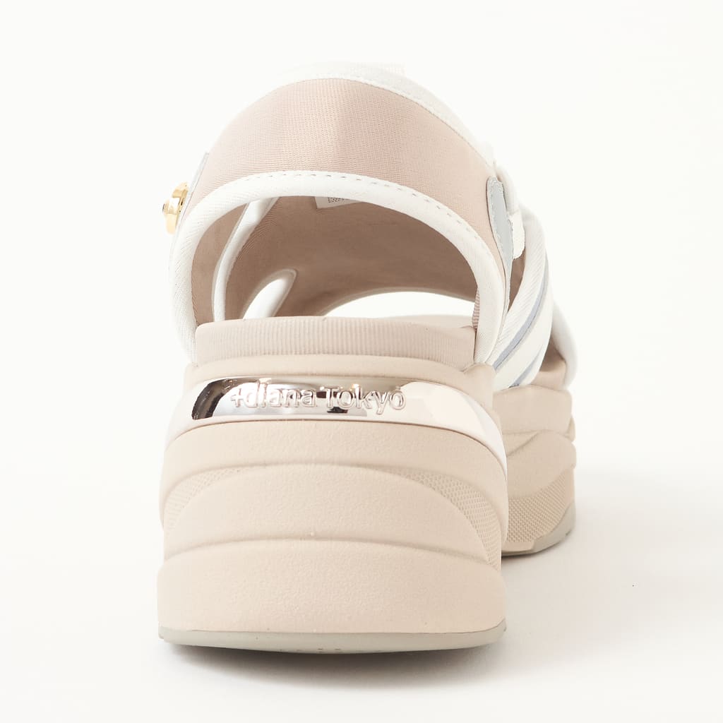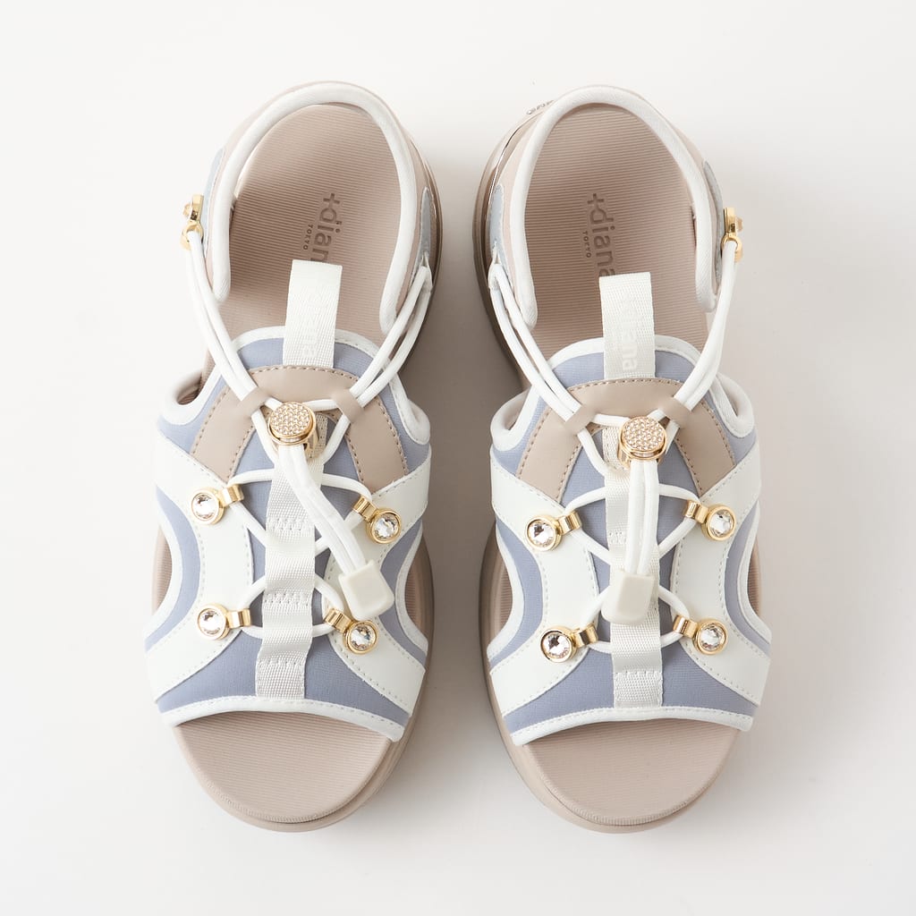 ★毎年人気のドローコードサンダルがアップデートして登場!新開発のフットベッドで履き心地がさらにアップし、ふかふかと弾むような、やみつきになる心地よさ♪程よいボリュームのオリジナルソールでスタイルアップも。ストッパーや紐通しのビジューが華やかさを添え、踵のメタルパーツでクラス感もプラスしました。カジュアルながらも洗練されたデザインでどんなスタイルにもマッチする、デイリーユースにぴったりの一足です。