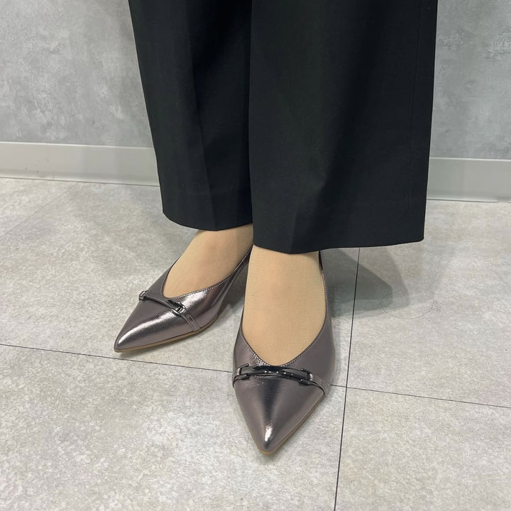 ★オンにもオフにも使いやすいシンプル金具つきのポインテッドトゥパンプス。